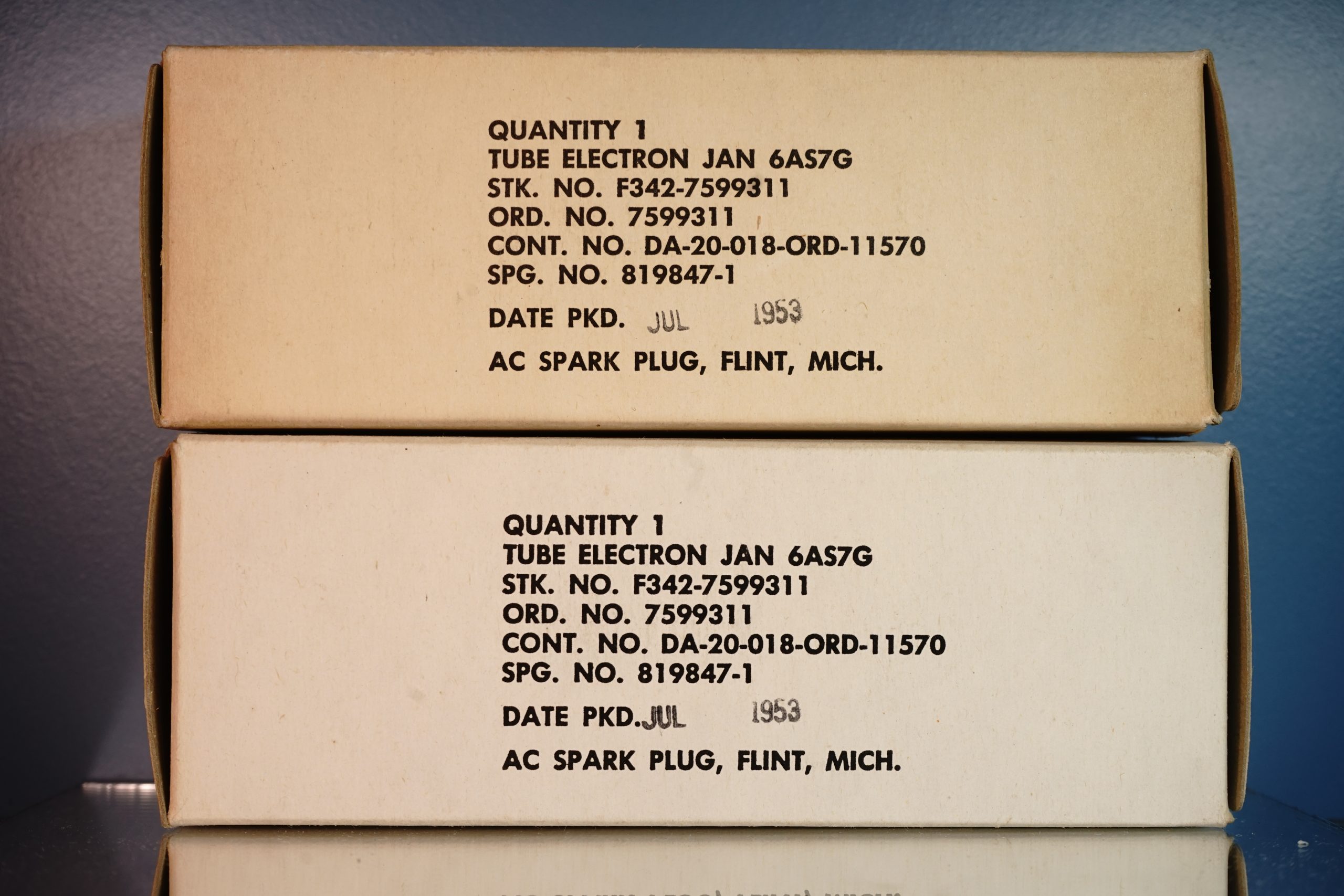 This is a beautiful matched pair of NOS/NIB 6AS7G tubes.They are made by RCA and were packed by the AC spark plug division of Ford in Flint, USA. These tubes are made in the first production year !! For the Joined Army and Navy in 1953 and packed in 1953 as well. In the box they are carefully wrapped in a cotton non woven envelope. See pictures