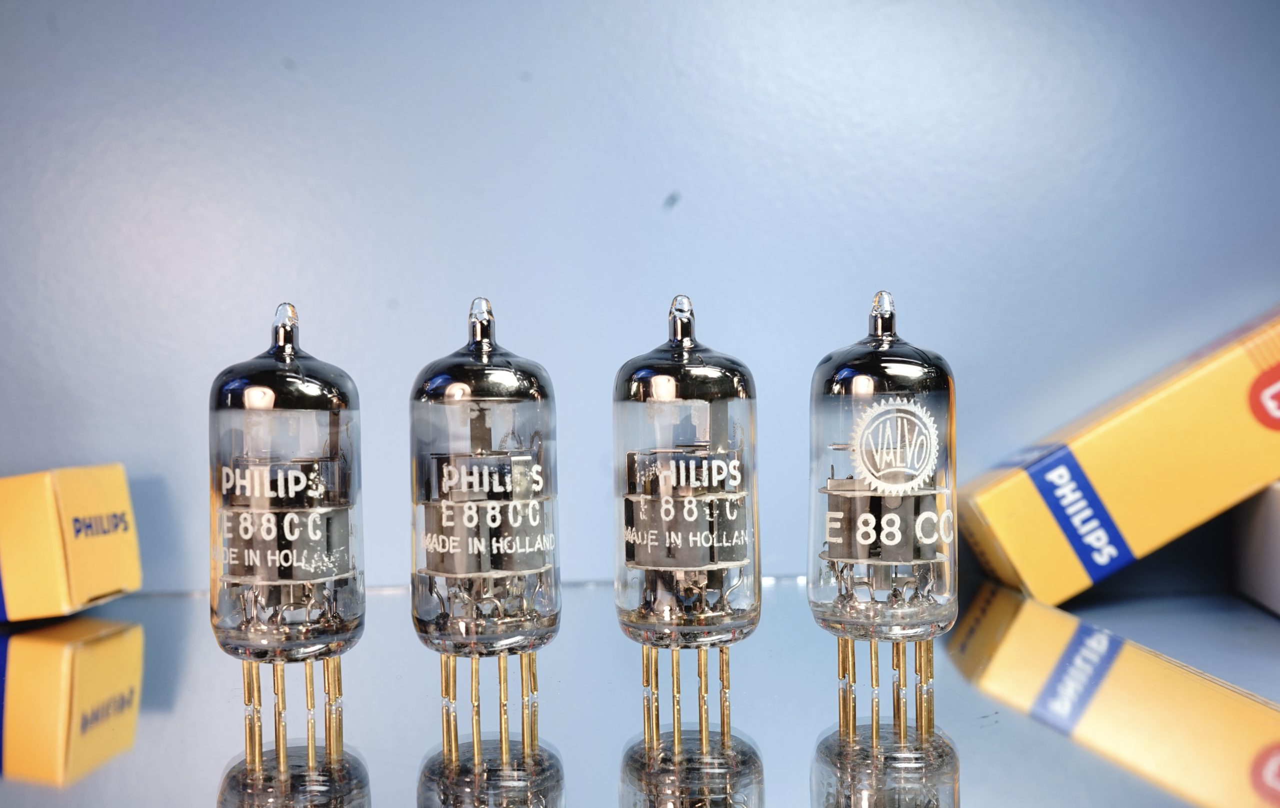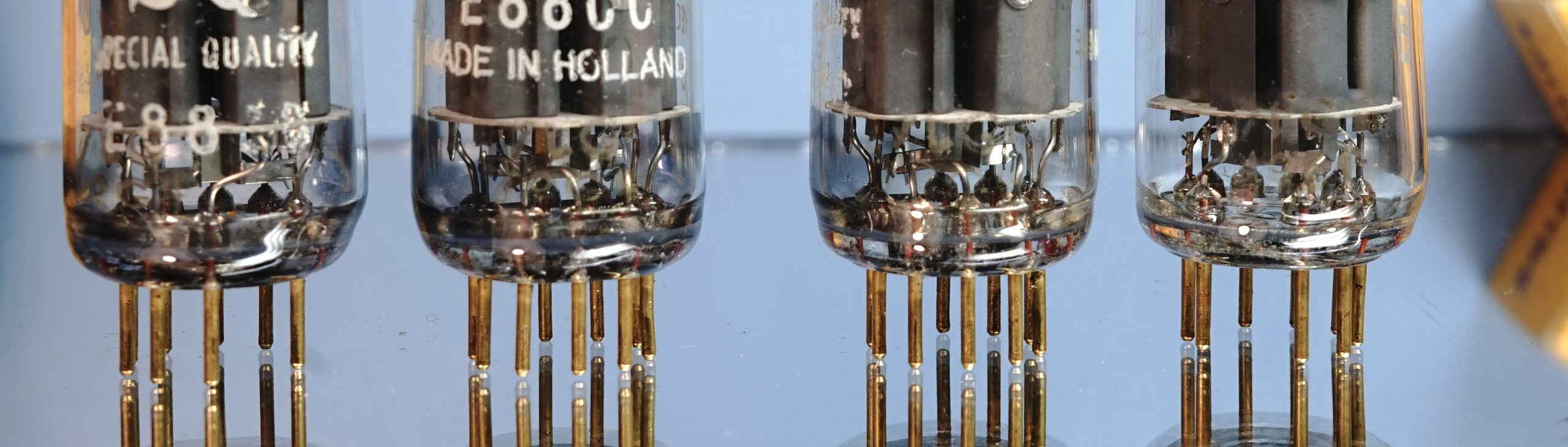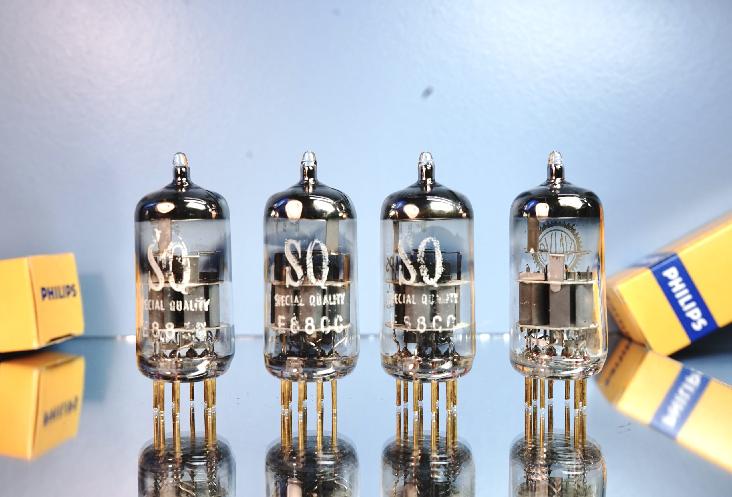 These Special Quality tubes have a grey shield and halo-getter. All four tubes are manufactured in 1969 (fourth week of july 1969). This very reliable, long life and low noise version of an ECC88 tube which is mostly used for military, professional or communication purposes. The properties of the Philips E88CC SQ for hifi applications are legendary and widely known. I refer to the many threads on the web for more information.