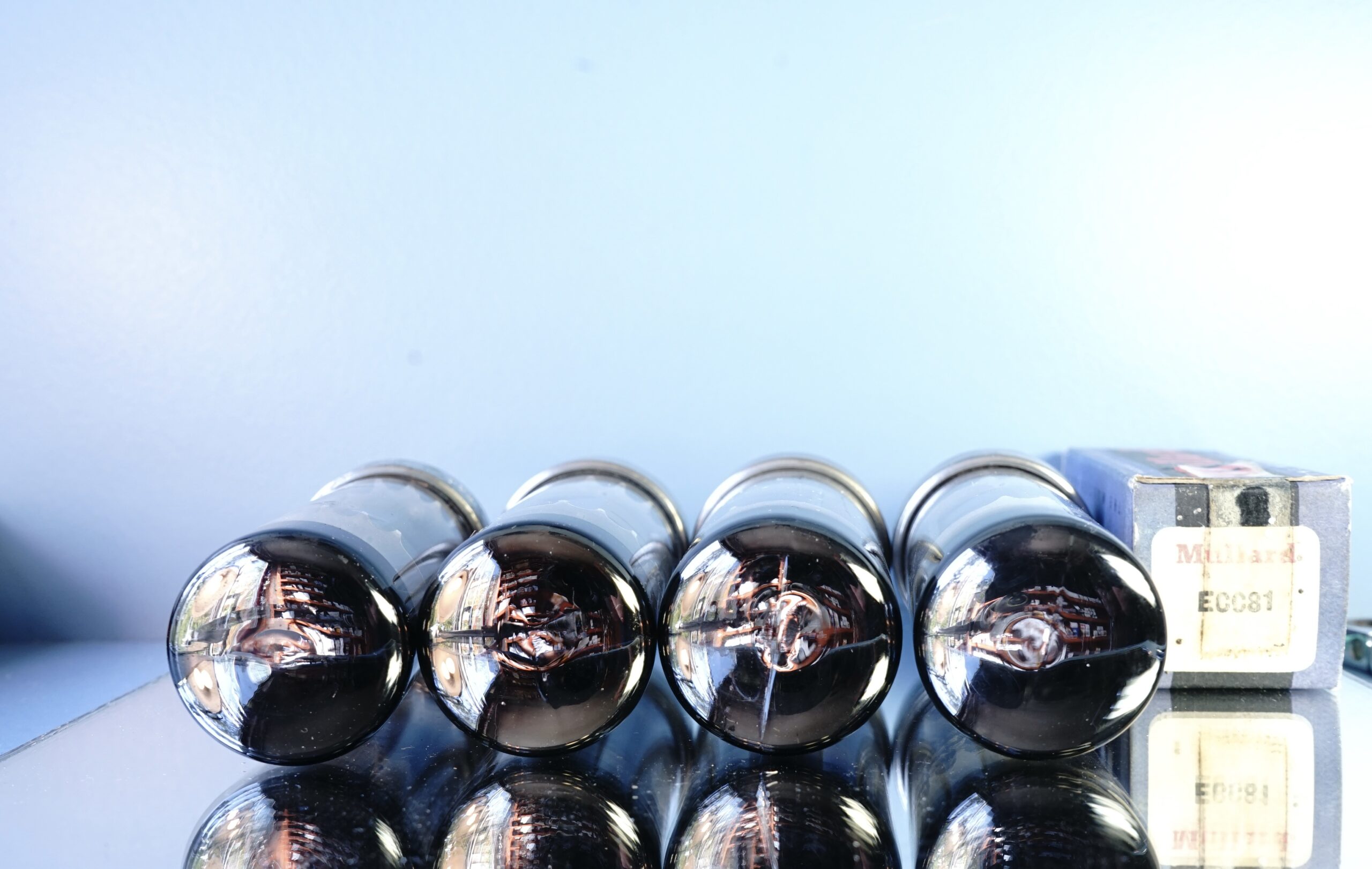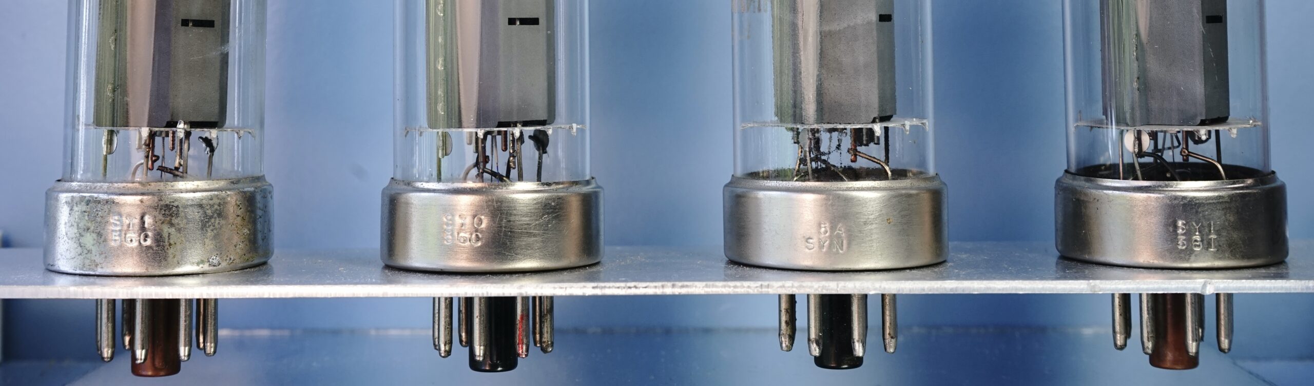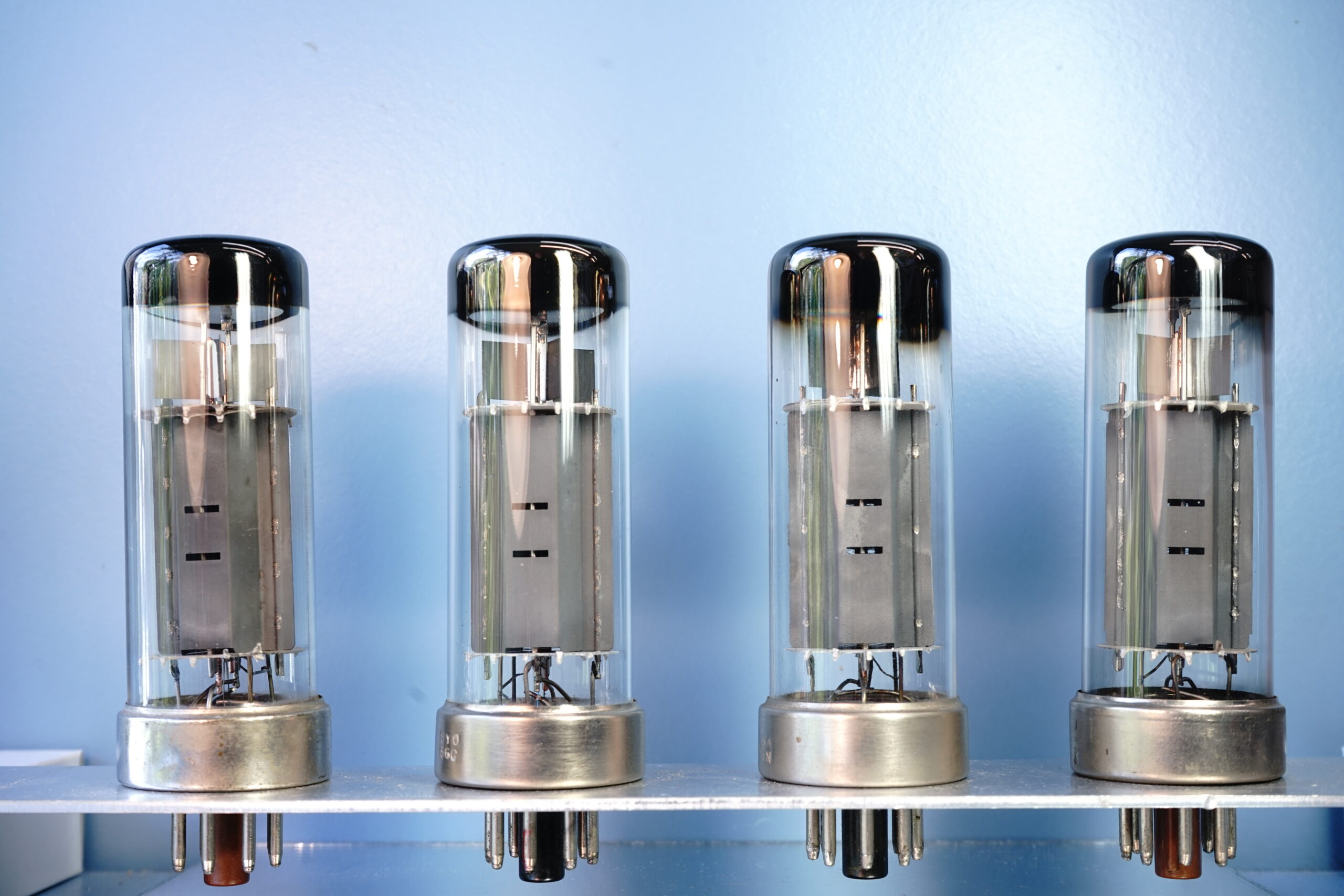 A matched Quad of metal base EL34 tubes made in the Philips Miniwatt factory in Heerlen, Netherlands.